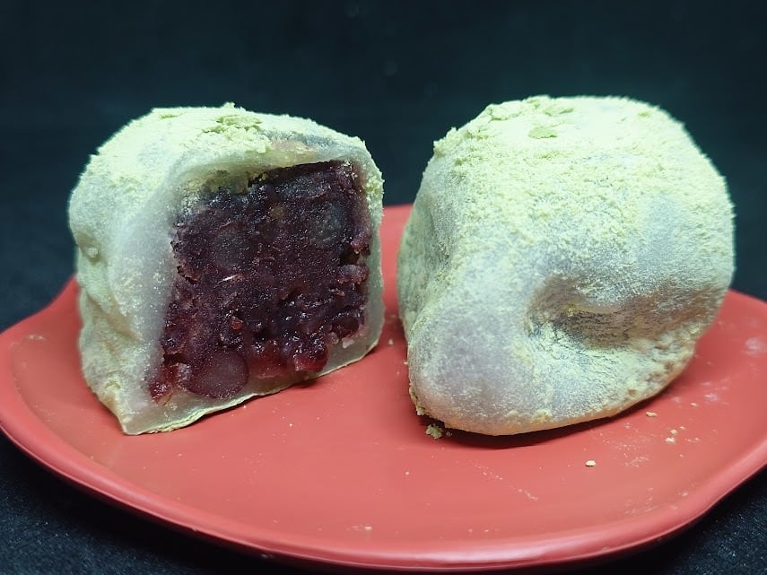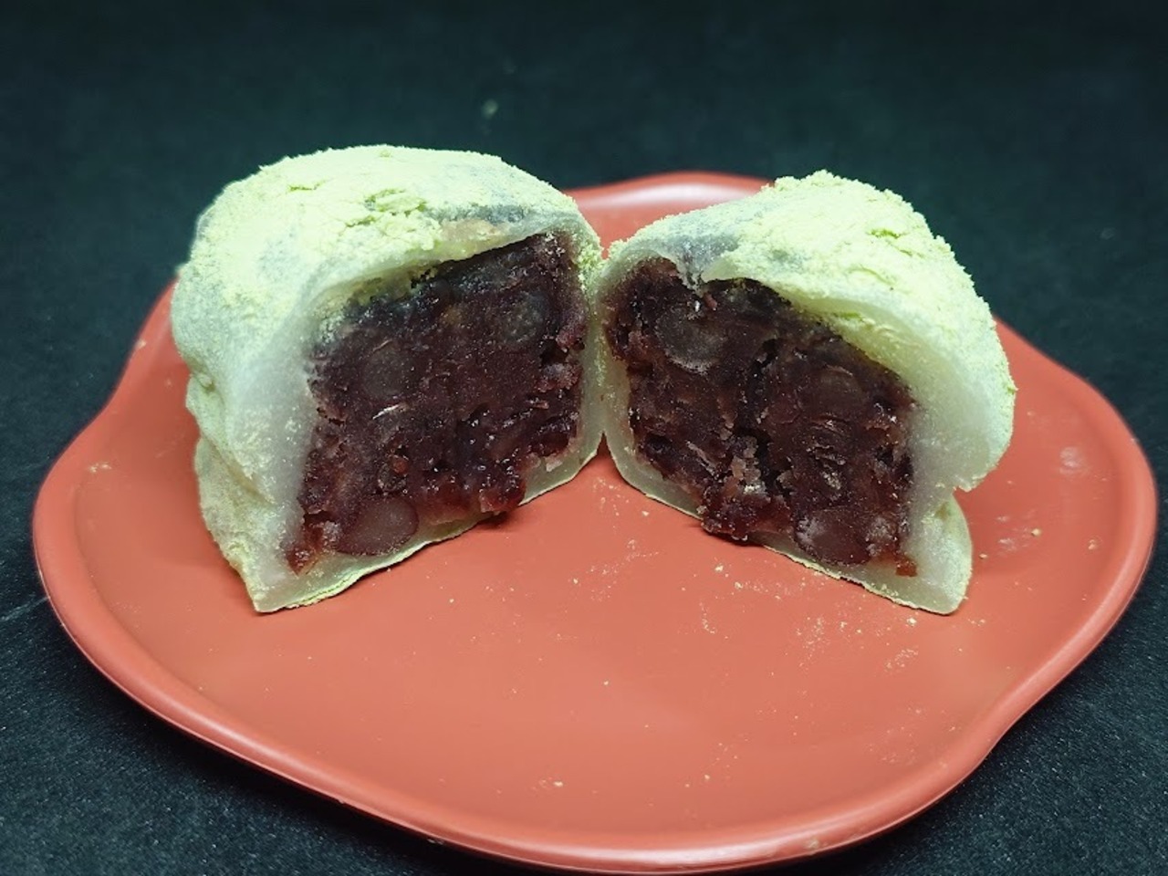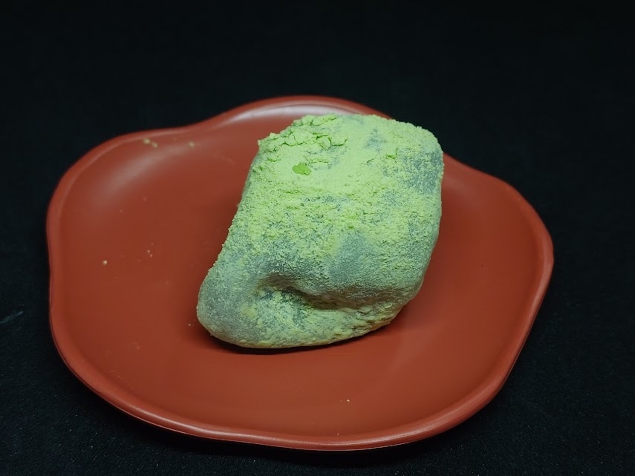 春を知らせるお菓子の紹介です。青大豆粉まぶして鮮やかな緑色が特徴のお菓子です。中には自家製の粒あんが入っており、それを求肥で包んでいます。もちもち感と粒あんの食感がクセになりますし、食べ応えのある商品です。